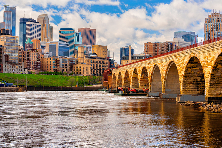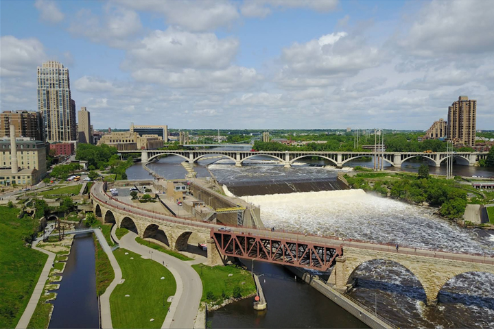 Journey back to a 19th century Minneapolis riverfront where mills and canals once formed the largest direct-drive, water-powered facilities in the world. Now linking Mill Ruins Park on the west and Father Hennepin Bluffs Park on the east bank, the stunning Stone Arch Bridge offers pedestrians and bicyclists views of St. Anthony Falls, the only waterfall on the entire Mississippi River.
