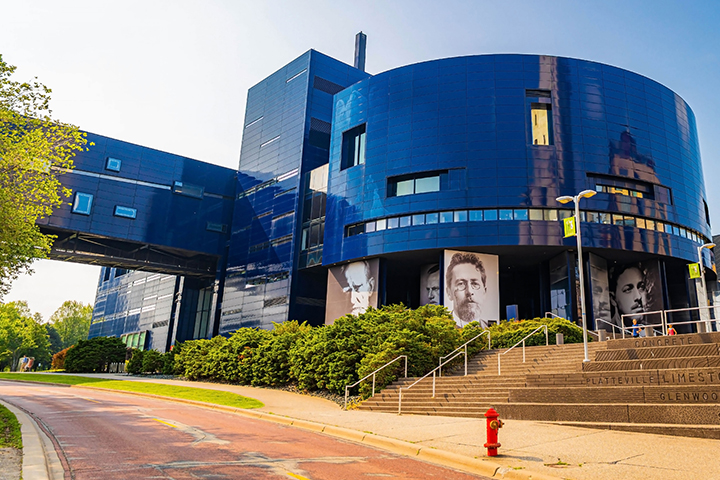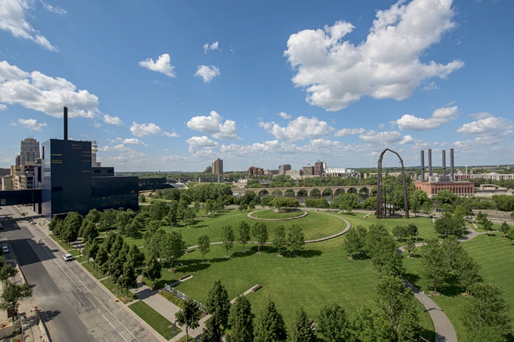 Mingle with dog walkers, picnickers, parents and joy-filled strollers as you climb the spiral sidewalk to a 32-foot grass mound for views of the Mississippi River, Stone Arch Bridge, and adjacent Guthrie Theater.