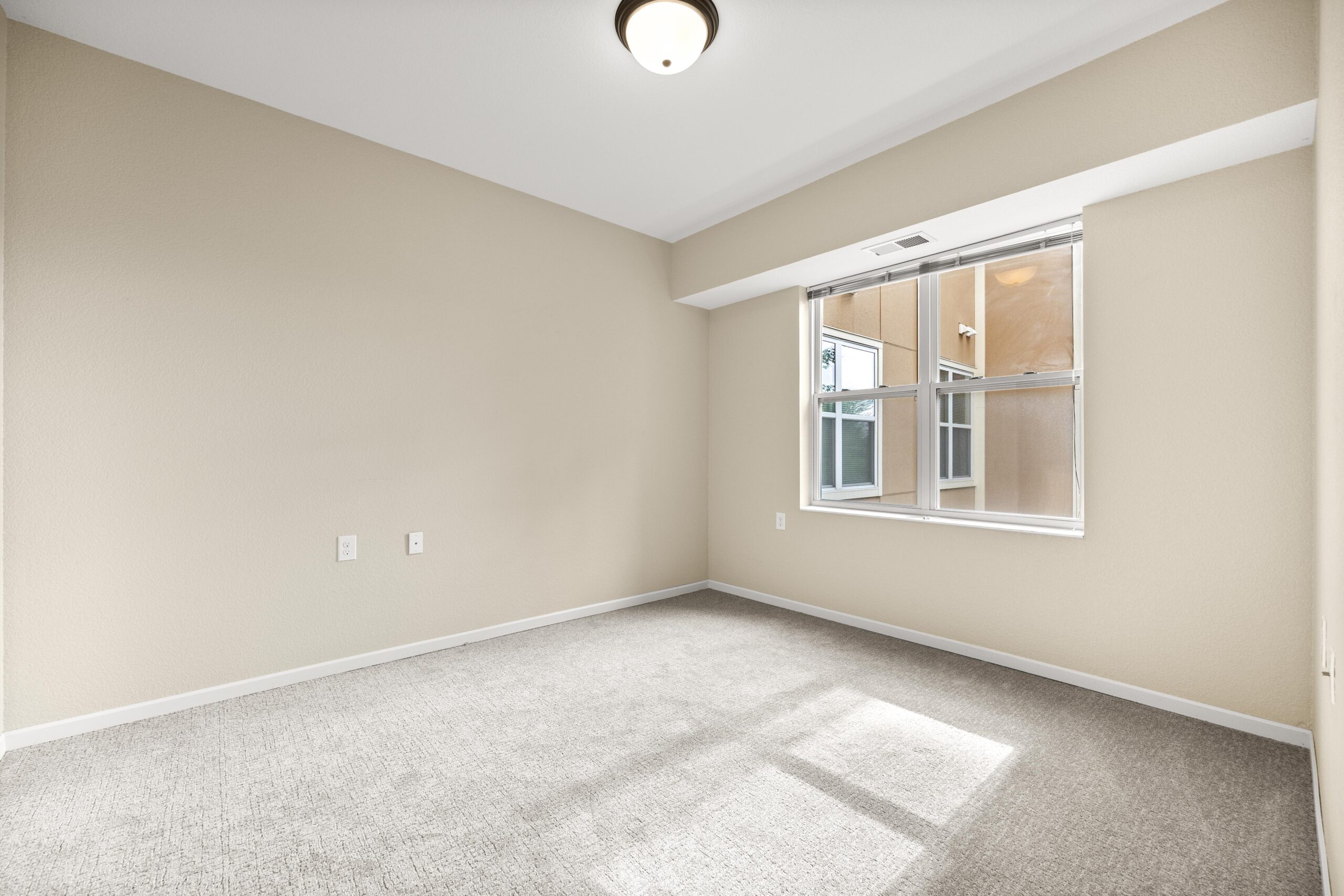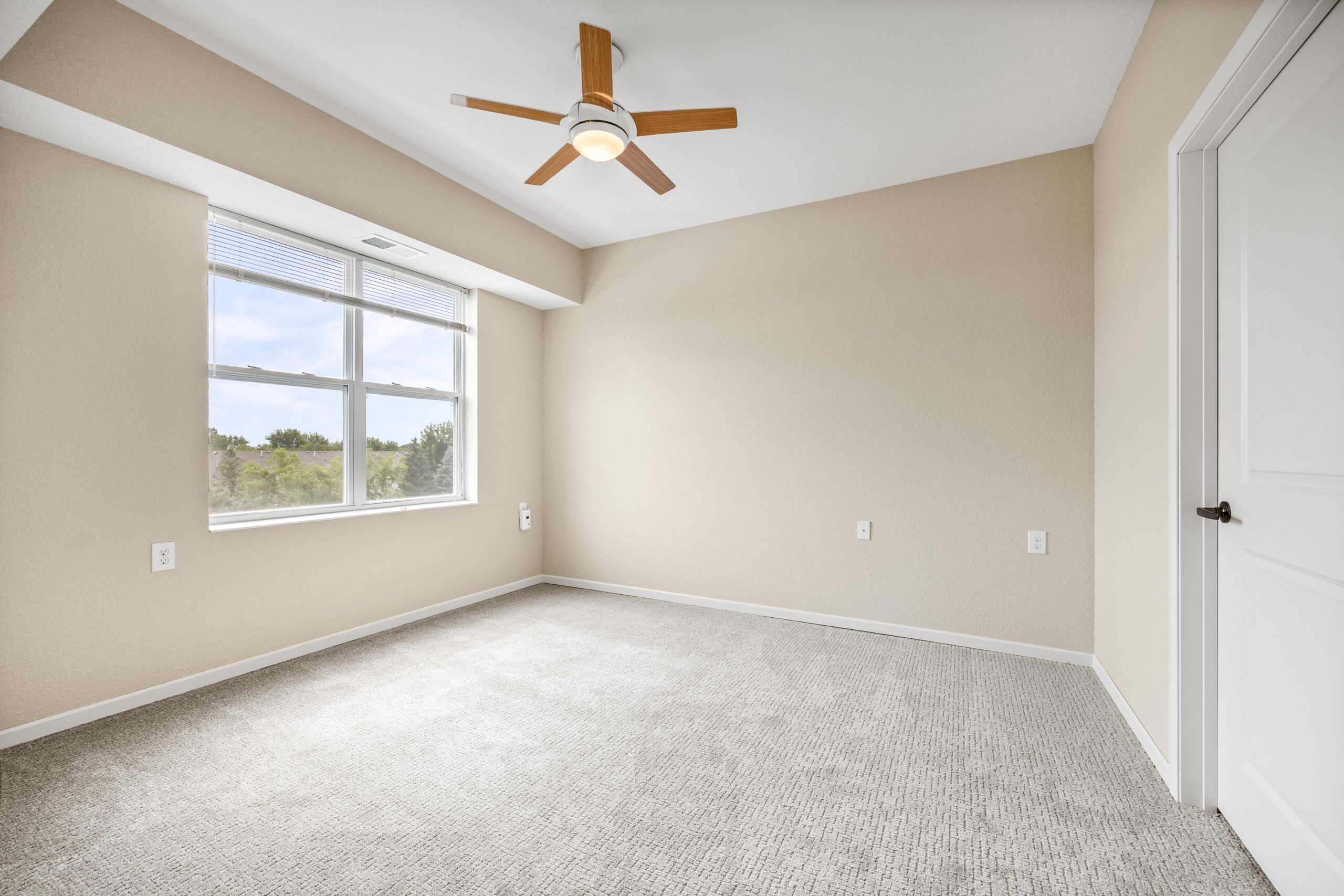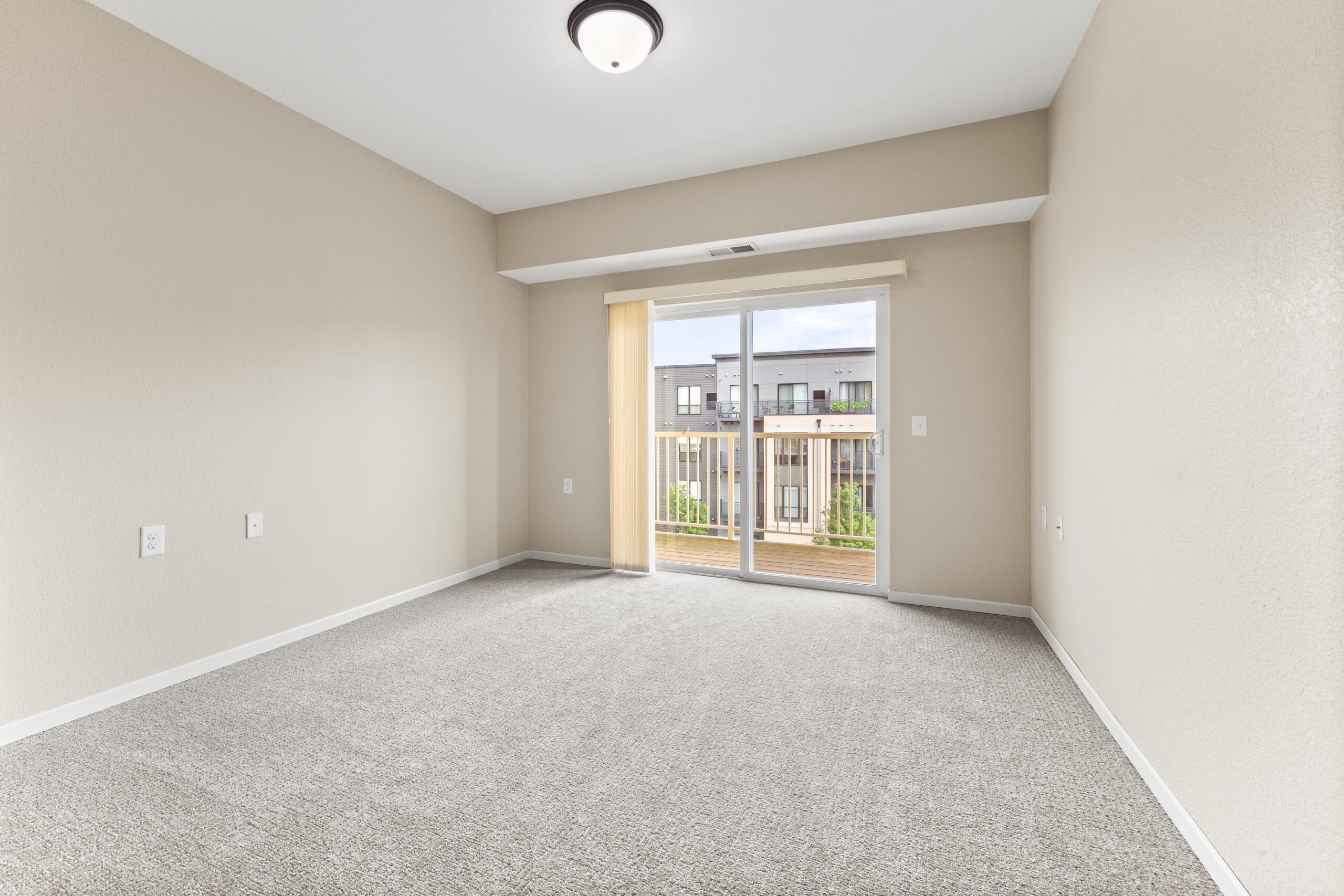A bright and furnished bedroom with light-colored carpet and a sliding door leading to a private balcony.