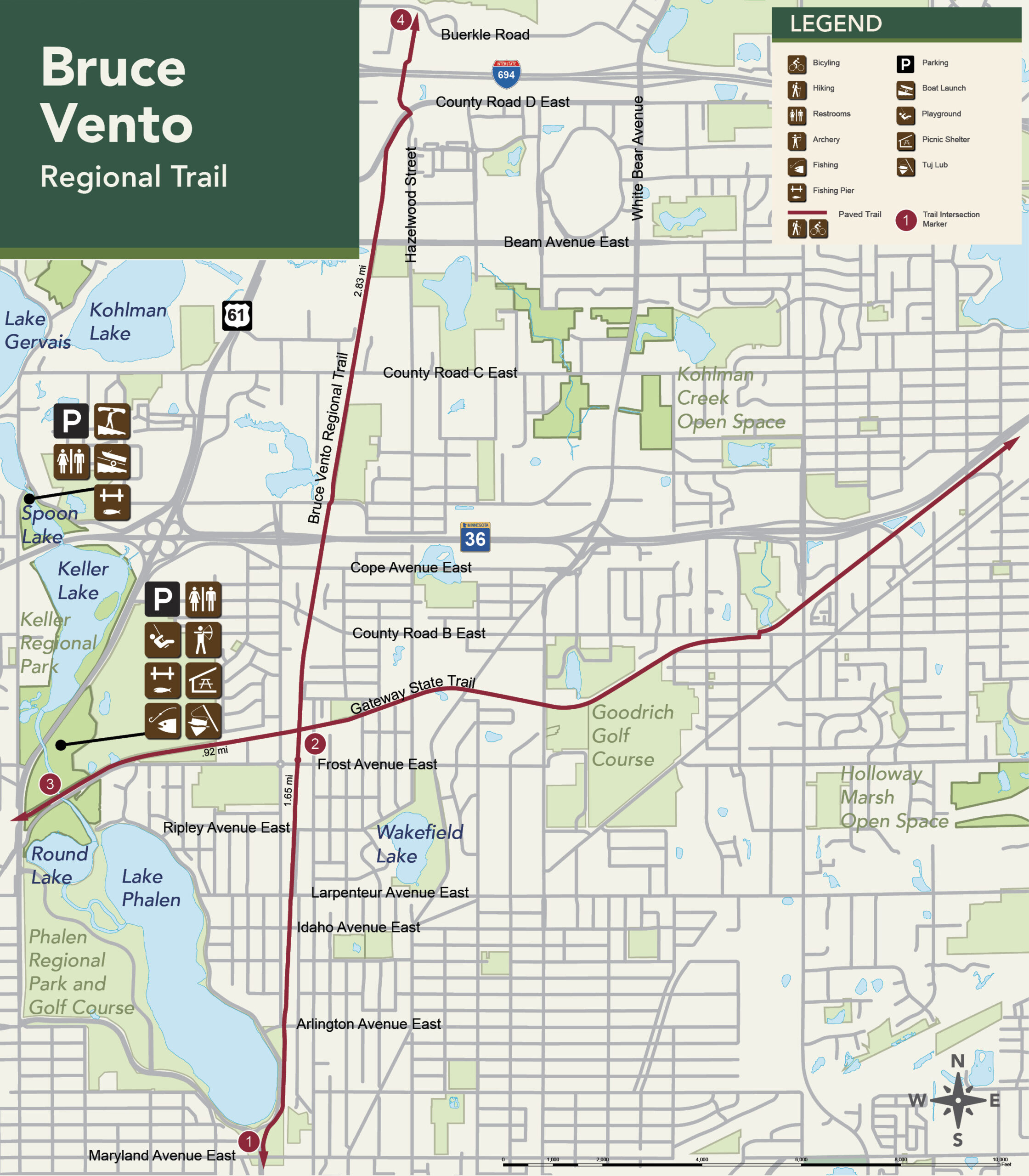 A treelined paved bike and walking path circles the neighboring park and wetlands. Take the short loop, the medium loop, or connect with the 13-mile Bruce Vento Regional Trail that leads north to White Bear Lake and south to Dayton’s Bluff in St. Paul.